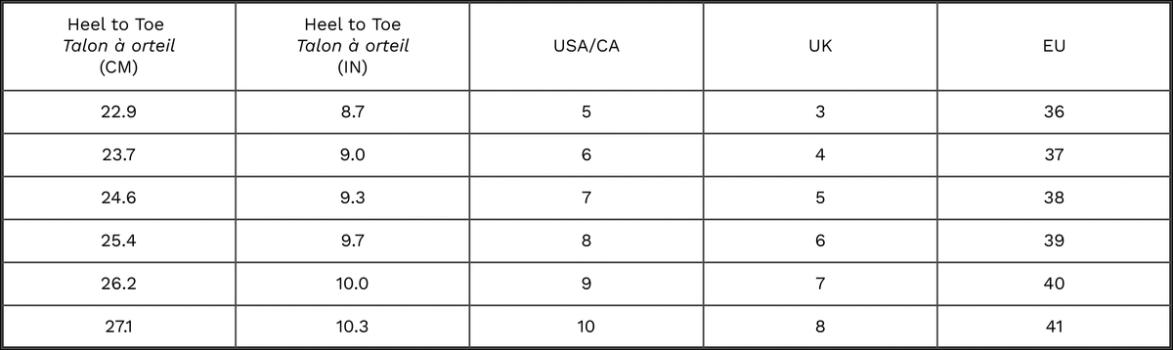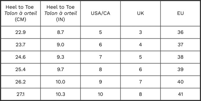 Offered in whole sizes. For an optimal fit, we suggest choosing the next size up if you are between sizes.